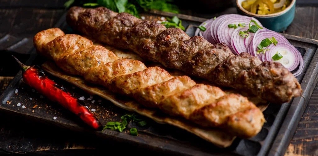 Рубленое мясо из нежнейшего куриного мяса со специями приготовленное на углях по оригинальному рецепту,— 200 гр.Маринованный лук.